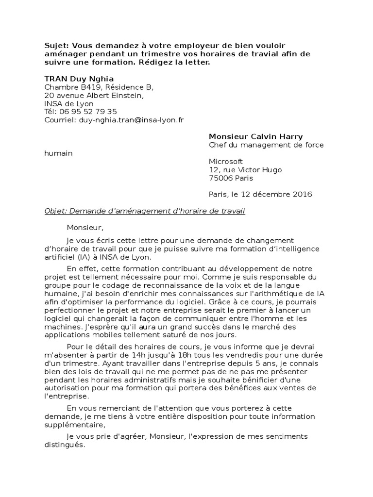 Pour demander un passage du travail de nuit à un travail de jour. Aménagement de mon temps de travail. Je vous écris aujourd'hui pour vous demander de bien vouloir m'accorder la modification de mes horaires de travail actuels afin que je puisse raisons justifiant un changement d'horaires.